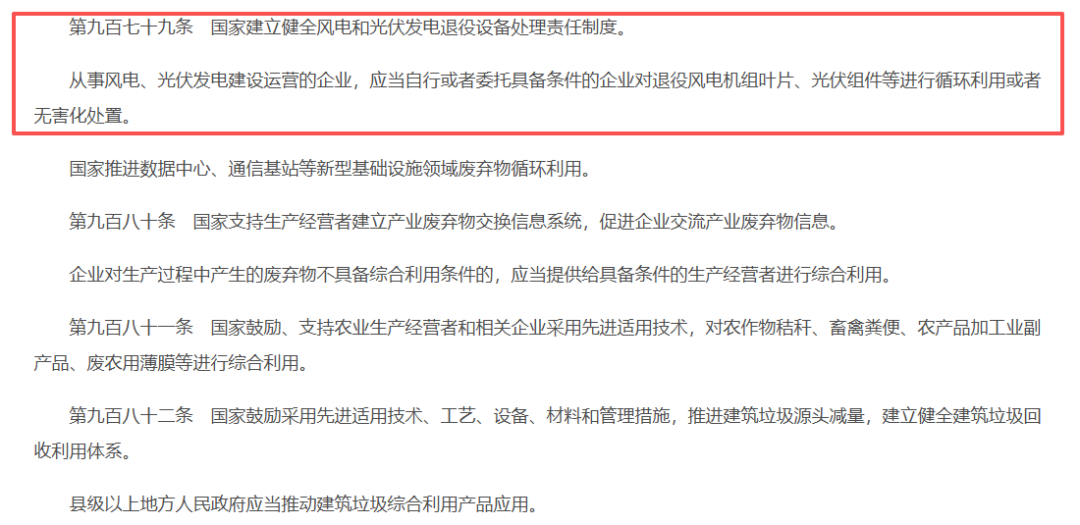 法典第 979 条进一步建立风电退役设备处理责任制度,明确要求从事风电、光伏发电建设运营的企业,应当自行或者委托具备条件的企业,对退役风电机组叶片、光伏组件等进行循环利用或者无害化处置,擅自填埋、丢弃将面临上不封顶的高额罚款、项目停摆等严重后果。